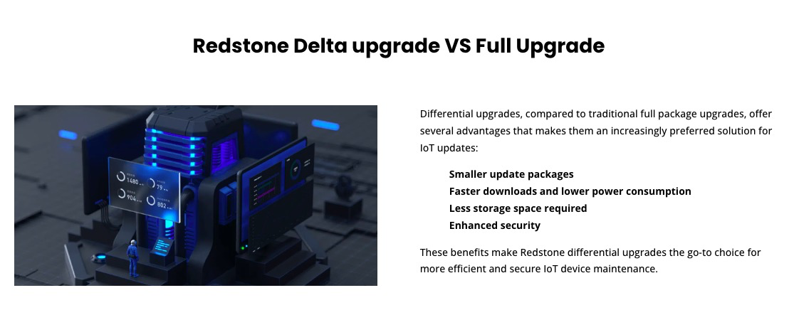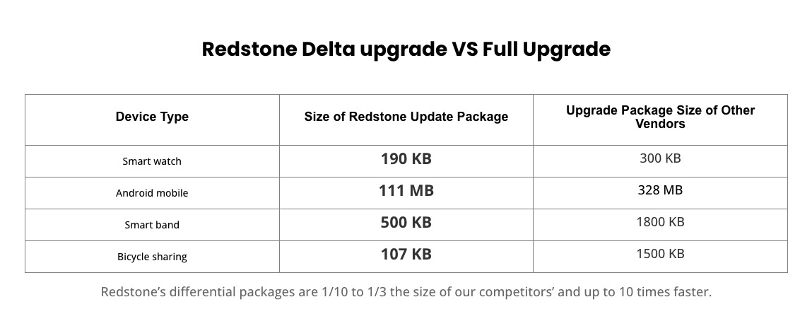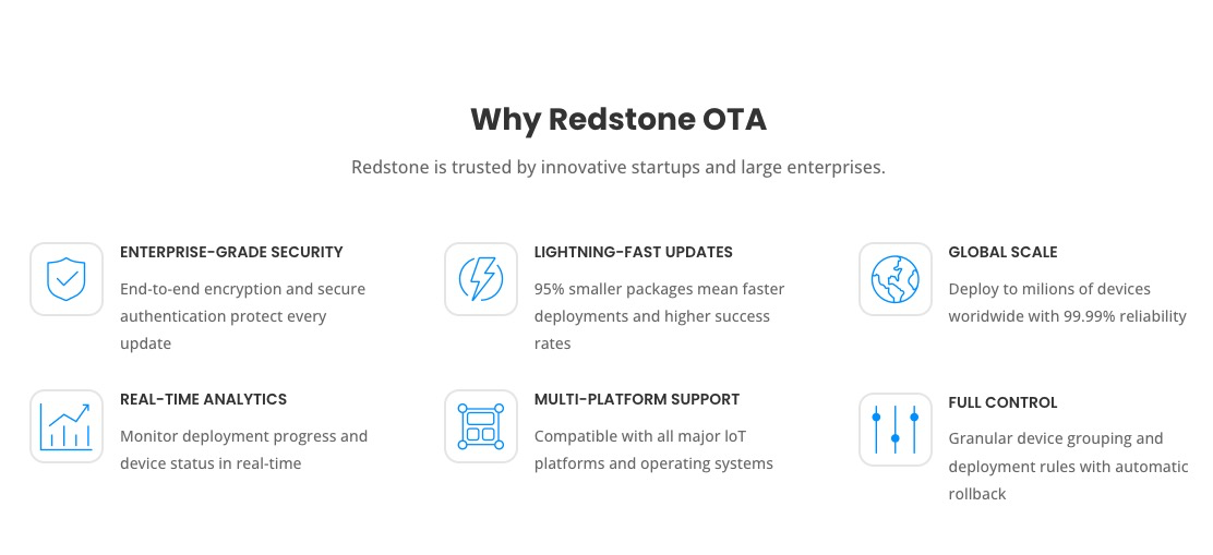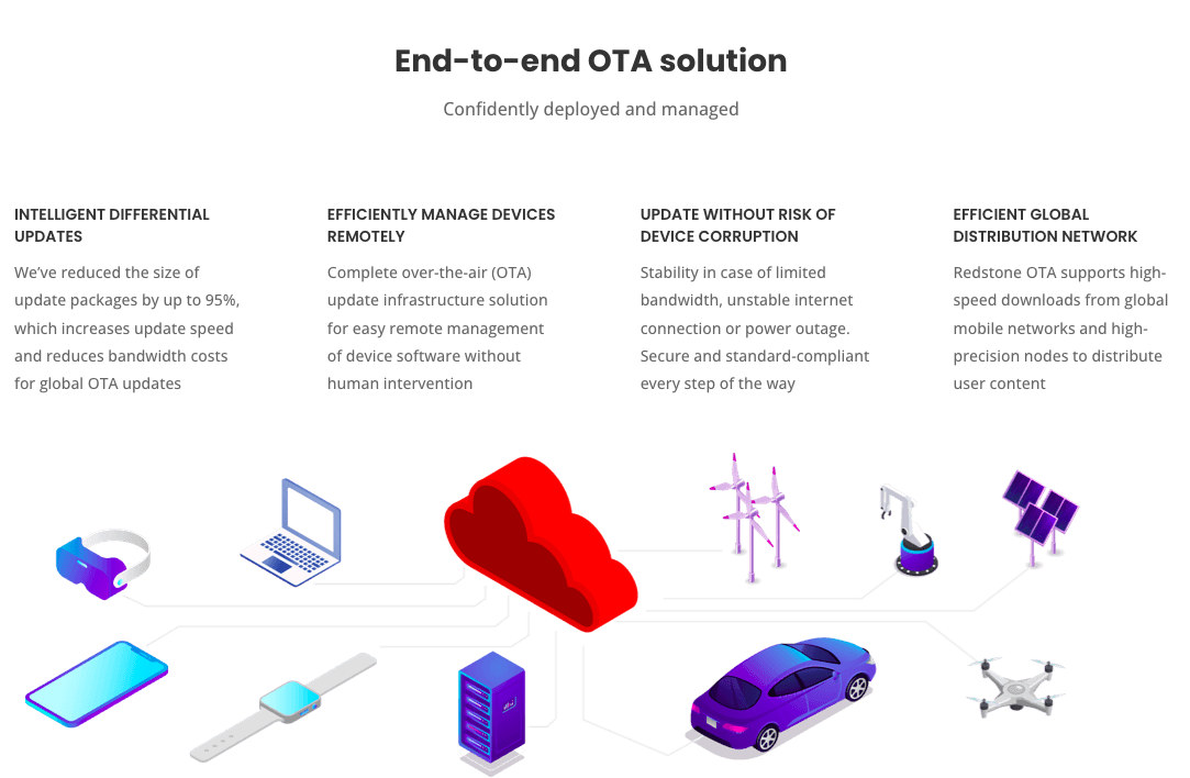 From startups to large organizations, Redstone provides secure, reliable,and fast remote updates for connected devices of any scale.